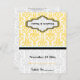 Carte de table personnalisée pour mariage en damas noir jaune aqua. La partie supérieure est ornée d'un motif en damas noir et blanc délavé et la partie arrière est jaune et blanc. Une bande noire et une autre aqua séparent les deux parties. Votre texte est saisi sur une étiquette élégante avec un contour blanc et jaune. Pliez la carte le long du centre.