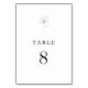 Ce numéro de table élégant est parfait pour un mariage simple. Le design se compose d'une carte minimaliste décorée d'une fleur dessinée à la main et d'une typographie romantique et fantaisiste. La carte s'imprime à l'avant et à l'arrière (double face). Les numéros peuvent être modifiés dans le champ de personnalisation.