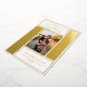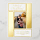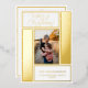 Dramatique mais simple, cette élégante carte de Noël géométrique éblouira vos amis et votre famille. Ajoutez votre photo, qui est encadrée dans de luxueux rectangles dorés larges. Le message "Joyeux Noël" écrit en cursive peut être personnalisé avec le message de votre choix. Les noms de famille et les noms individuels sont présentés dans une police de caractères dorée classique qui ressort sur le fond blanc. Au verso de la carte, se trouvent l'année et un message simple que vous pouvez personnaliser ou supprimer. Une déclaration élégante pour vos vœux de fin d'année. Également disponible en véritable feuille métallisée rose gold et argent.