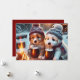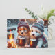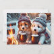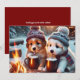 Carte à plat saisonnière 5 x 7 avec deux adorables chiots profitant d'une boisson chaude près du feu de camp après une aventure amusante dans la neige.