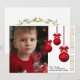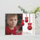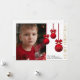 Des ornements rouges accrochés à des rubans rouges décorent cette jolie carte de Noël. Customisez ce design de vacances traditionnel avec votre photo préférée. Ajoutez votre nom de famille, les noms des membres de votre famille et l'année pour faciliter votre passage à cette année carte de Noël. Le côté arrière a une conception de coordination.