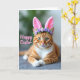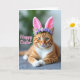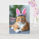 Cette carte représente un chat roux détendu avec des rayures ambre et une poitrine et des pattes blanches, allongé avec ses pattes avant doucement croisées comme s'il posait pour un portrait printanier charmant. Des oreilles de lapin rose tendre se dressent sur sa tête, et une petite couronne de minuscules fleurs de lavande ajoute une touche tendre et amicale 🐰. Les yeux verts du chat regardent droit devant avec un calme et une affection concentrés, comme s'il partageait un moment de tranquillité avec quelqu'un de proche. La lumière tombe doucement sur la fourrure, faisant ressortir la texture lisse et les fines moustaches blanches qui se déploient de son museau. Derrière le chat, l'arrière-plan se fond dans des lavis flous de vert feuillu et de gris atténué, gardant l'attention sur le visage et les oreilles. Un court message de Pâques apparaît sur l'image en lettrage rose rosé