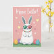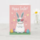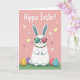 Cette carte présente un lapin blanc amical centré sur un fond rose saumon, debout sur une fine bande d'herbe verte brillante tout en portant des lunettes rondes avec un verre émeraude et un verre corail 🐰. Un collier de petites perles multicolores repose sur son cou, ajoutant une touche douce et sociale comme s'il était habillé pour rencontrer quelqu'un de spécial. Près de ses pieds sont posées quatre formes d'œufs décorés en jaune ensoleillé, lavande doux, rose chaud et céruléen frais, chacun parsemé de petits motifs et de petites marques florales qui ressemblent à un projet de printemps partagé. Dans la partie supérieure, de petits cœurs pastel en crème, jaune pâle et bleu clair flottent autour comme de douces allusions d'affection entre amis. L'aspect général reste doux et cosy, avec des textures lisses et des couleurs calmes qui font que la scène se sent décontractée et accueillante 🌷. Une phrase fluide est placée au-dessus du lapin dans une teinte coordonnée plus foncée, se détachant clairement sur le fond rose. Les cœurs sont dispersés