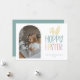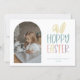 Hoppy Paster Photo Holiday card. Caractéristiques, typographie pastel avec accent d'oreille lapin, cadre photo voûté et coordination couleur de fond turquoise.