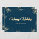 Cartes de vacances élégantes bleues et dorées présentant des flocons de neige et de la neige sur un fond bleu. Un beau titre écrit à la main avec un effet de dorure à la feuille au centre. Personnalisez facilement ces cartes de vacances à motif de flocon de neige bleues et dorées avec le nom de votre famille et votre message. Les demandes personnalisées sont les bienvenues.