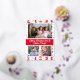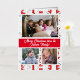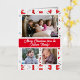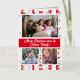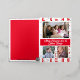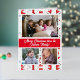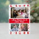 Le design dispose d'une salle pour trois photos à l'avant, avec arrière - plan à motifs de casquettes Père Noël, bas de Noël et sucres de canne. Les coins avant du centre affichent votre texte en blanc cursif contre un support rouge rectangulaire. Le côté inverse comporte un arrière - plan tout-rouge à votre texte, affiché dans la même police blanche et cursive.