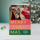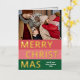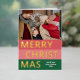 Carte de voeux de Noël unique, tendance et simple et chic de Noël avec votre photo d'hiver préférée et votre véritable feuille d'or MERRY CHRISTMAS texte sur un motif rouge corail, rose roux et vert forêt coloré de rayures audacieuses. Avec place pour customiser ou personnaliser avec une photo et nom de famille ou les noms de votre choix sur le devant, et salutation personnelle ou message de vacances sur le côté arrière de la carte.