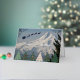 Seasonal holiday card that features a scenic, landscape photo image of snow covered Mount Hood with colorful Christmas tree symbols and a Santa Claus sleigh with reindeer silhouette, along with Season's Greetings in silver foil printing.