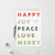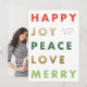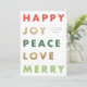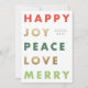 Une carte de vacances typographique moderne avec des caractères gras et lumineux de différentes couleurs et une feuille d'or, ainsi qu'une photo de client à fond perdu au verso.