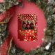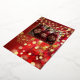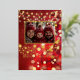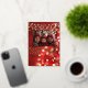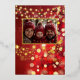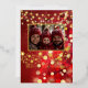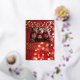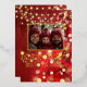 Carte de vœux de vacances en feuille d'or véritable, ajoutez votre photo. Avec un joli fond de lumières bokeh rouge et or. Orné de flocons de neige en feuille d'or, de boules rouges et de guirlandes lumineuses.