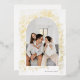Une photo de famille moderne et tendance en forme d'arche brille sous une véritable cascade de feuilles d'aluminium en points scintillants et en formes d'étoiles sur cette simple carte de vacances photo.