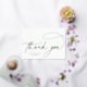 Simple et élégant 5x7 cartes de remerciement caractéristiques "merci" dans le script de calligraphie de feuille d'or lettré à la main sur un arrière - plan blanc. Personnalisez avec votre texte personnalisé ci-dessous; montré avec "du futur Mme. [nom]". Ajoutez un message personnel pré-imprimé à l'intérieur.