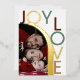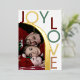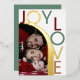 Découvrez cette carte de vacances moderne et sympa pour répandre la bonne humeur cette saison. Sur le devant, il y a un joli design en arche où vous pouvez mettre votre propre photo. De plus, elle est dotée d'un véritable feuilletage en or qui lui donne un look particulièrement élégant. Les mots JOIE et AMOUR sont écrits dans des nuances de vert, de bordeaux, de terre cuite et d'or, un style qui se sent à la fois moderne et classique. Au dos, il y a suffisamment de place pour écrire votre propre message personnel. Le fond vert clair donne à l'ensemble de la carte un aspect soigné. Elle est imprimée sur un excellent papier cartonné, ce qui la rend agréable au toucher également. Cette carte est un moyen simple et chaleureux d'envoyer des vœux de Noël et de Nouvel An qui se sentent personnels et qui ont fière allure.