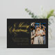Un design élégant avec "Joyeux Noël" dans un script de calligraphie orné et feuille d'or. La couleur arrière - plan est gris foncé et personnalisable. Le cadre autour de l'image, et le message customisé avec le nom du couple en dessous, sont aussi en feuille d'or. (Il y a un choix de feuilles de couleurs différentes.)