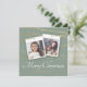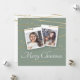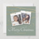 Une carte de voeux de Noël très design et moderne avec deux de vos propres photos sur le devant accrochées à de jolis cadres blancs sur des lignes géométriques dorées. Avec de belles étoiles dorées sur un arrière - plan vert.