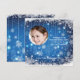 Un design bleu et blanc époustouflant avec des bordures de flocons de neige, des flocons de neige en cascade et une fenêtre photo ronde pour votre photo préférée. Parfait comme carte de vacances ou invitation pour une fête d'anniversaire hivernale. La carte est facile à personnaliser avec votre texte, police, couleur de police et choix parmi six types de papier.