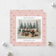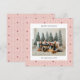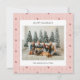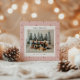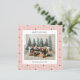 Carte de vacances avec un fond de papier peint rayé rouge et rose avec une photo de famille associée à un vœu de vacances et votre nom et année dans une police sans serif.