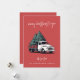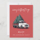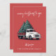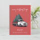 Une carte de Noël festive 5x7 à plat avec la mention joyeuse « Joyeux Noël à vous » dans une typographie manuscrite moderne blanche associée à un graphique vintage représentant un camion de livraison de sapin de Noël. Conçue sur un fond rouge crépusculaire, cette carte de vœux rétro élégante allie charme nostalgique et mise en page minimaliste moderne. Personnalisez la section « avec amour de » et en dessous avec le nom de votre famille dans une typographie complémentaire pour un effet chaleureux et personnalisé. Parfaite pour partager l'amour et les vœux de fêtes, ce design amusant et classique non photographique ajoute de la personnalité à la saison tout en répandant la joie festive. Un design de Noël intemporel idéal pour les familles, les individus et les couples.