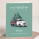 Une carte de vœux de Noël festive 5x7 pliée avec le titre joyeux « Joyeux Noël à vous » dans une typographie manuscrite moderne blanche associée à un graphique vintage représentant un camion de livraison de sapin de Noël. Conçue sur un fond vert forêt, cette carte de vœux rétro élégante allie charme nostalgique et mise en page minimaliste moderne. Personnalisez la section « avec amour de » et en dessous avec le nom de votre famille dans une typographie complémentaire pour un effet chaleureux et personnalisé. Parfaite pour partager l'amour et les vœux de fêtes, cette conception amusante et classique non-photo ajoute de la personnalité à la saison tout en répandant la joie festive. Un design de Noël intemporel idéal pour les familles, les individus et les couples.