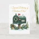 Diffusez la joie des fêtes avec cette carte de Noël Victorian Splendor. Avec une charmante boîte aux lettres vintage enneigée et ornée de feuillage festif vert et or, ce design capture l'élégance nostalgique et la chaleur d'un Noël victorien traditionnel. Parfait pour envoyer des salutations sincères et des vœux joyeux à la famille et aux amis.