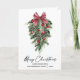 Carte de Noël pliée élégante moderne encre de calligraphie script pins aquarelle verdure hivernale avec noeud ruban rouge burgundy ornements de Noël, pommes de pin et baies de houx Joyeux Noël