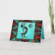Personnalisez cette carte de vœux Southwest "unique" ! Elle présente un Southwest Kokopelli jouant de la flûte sous le soleil sur un fond turquoise, entouré de bordures turquoise, orange et noires et les mots édifiants..."Paix sur Terre" !