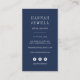 Les élégants cartes de visite verticaux de votre entreprise côtière présentent une illustration de hippocampe d'aquarelle avec votre nom et/ou nom d'entreprise en dessous. Personnalisez l'envers avec vos coordonnées, y compris trois icônes de médias sociaux et un champ de modèle pour votre nom d'utilisateur de médias sociaux, en blanc sur bleu marine.