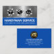 Une couche supérieure d'argent et une pièce bleu cobalt sont délimitées par une ligne d'argent. La couverture comprend trois bijoux en faux argent qui contiennent des outils de main-d'oeuvre qui peuvent représenter une partie du travail/service que vous offrez, par exemple le marteau est pour la menuiserie-maison réparation, le pinceau à rouleaux pour la peinture-remodelage à la maison et enfin la trowel-shovel-fourche peut représenter l'aménagement paysager, le jardinage etc. La broche elle-même peut représenter des réparations mécaniques. La description de leur utilisation est laissée à votre propre interprétation. La couche bleu cobalt contient le nom d'entreprise "HANDYMAN SERVICE" et une liste de services que vous pourriez offrir. ; Changez-les pour qu'elles répondent à vos besoins de service. En surplomb, dans une couverture bleu cobalt, un logo doré domine le paysage que vous pouvez utiliser est en haut. Vous y trouverez votre nom prestigieux, vos coordonnées et une option de slogan pour faire connaître vos services. Une grande carte professionnelle pour les entreprises de construction et de bricolage. #handyman #constructionhandyman #homerepaircontractant #homerepairhandyman #construction #chantier #chantier #rénovation #travaux de rénovation #handymantools #construction #zazzlemade