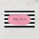 carte de visite de maquillage cool et chic avec rayures noires et blanches et une pastille de rouge à lèvres rose.