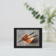 Cette carte de collection d'artiste montre une conception simple de deux baguettes équilibrées sur une cuvette colorée d'or carrée. Les lignes et la texture du tapis sous lui accomplissent l'effet abstrait intéressant.