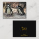 Cette carte de commerce d'artiste présente deux adorables pingouins africains debout sur une corniche rocheuse. Ce sont des oiseaux aquatiques sans vol dont les ailes sont devenues des palmes. Chacune a une bande noire et des taches noires sur la poitrine. Le motif de taches est unique pour chaque pingouin, tout comme les empreintes digitales humaines. Ils ont des glandes roses au-dessus des yeux et des pieds roses et noirs.