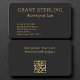 Professional business card designed for attorneys using a sleek black color palette with gold accents. The layout includes a QR code to share online information while keeping the design clean, polished, and easy to read. Suitable for attorneys, law offices, and legal professionals. Fully customizable text and QR destination with a print-ready layout.