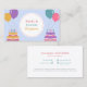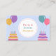 Une carte de visite d'entreprise d'organisation de fêtes et d'événements décorée de gâteaux d'anniversaire et de ballons colorés dans des tons de couleurs joyeuses. Parfait pour les cartes d'invitation ou pour les organisateurs de fêtes tels que les fêtes d'anniversaire pour les enfants ou les adultes, les lancements de produits, les baby shower, les célébrations de famille, les anniversaires de mariage, les enterrements de vie de garçon, les fêtes à thème, etc.