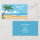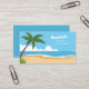 Un carte de visite avec l'illustration d'une plage de sable, un ciel bleu, des nuages et un palmier aux feuilles verts et peu de noix de coco. Il peut être utilisé pour la location de vacances près de la plage, bed & breakfast ou maison d'hôtes, même agent immobilier!