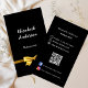 Un arrière - plan noir classique. Décoré d'un arc doré. Personnalisez et ajoutez vos nom, titre et coordonnées. Ajoutez votre URL/lien de site Web au code Qr. Avec des icônes Facebook et Instagram. Texte blanc.