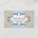 Ce carte de visite bleu doux de point de polka évoque la douceur de ses éléments graphiques à la palette de couleurs. L'arrière - plan est taupe avec un recouvrement de motif de point. La raison sociale, la description, et le contact principal se tiennent dans un cadre fleuri avec des enjolivures. L'inverse indique le même arrière - plan avec le reste d'information d'affaires avec l'élément cranté par bleu encadrant au dessus et au bas. Appropriez-vous pour des affaires adaptées au secteur girly, un établissement de nourriture qui se spécialise dans des festins doux ou une boutique. Disponible dans des couleurs alternatives avec les produits assortis.
