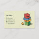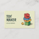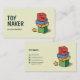 Un carte de visite avec un arrière - plan jaune pastel doux pour un fabricant de jouets ou un magasin de jouets avec une pile de blocs de jouets en bois aux couleurs vives dans une atmosphère dessinée à la main. Les blocs sont disposés dans une tour fantaisie avec un bloc rouge placé sur le dessus, affichant un texte personnalisable, et une étoile unique stylisée se trouve près du coin inférieur. Il pourrait être utilisé par une fabrication artisanale de jouets en bois, construction ou jeux éducatifs, etc.