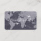 A modern and blue contact card for an elegant professional... your name and profession printed in a script font style, with small airplanes and a map of the world on a distressed dark blue background...