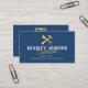 Make a bold, professional first impression with these modern construction contractor business cards. Featuring a stylish blue background and a striking faux gold foil hammer and spanner logo, this design is perfect for builders, contractors, and trades professionals who want to stand out.
