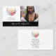 Esotérique Boho Moon Crystals Plumes Fleurs Carte de visite avec modèle photo et arrière - plan blanc. Aquarelle bohème avec une lune croissant, quartz rose et cristal de citrine pointes, roses roses roses, verdure et plumes blanches. Parfait pour votre métaphysique, ésotérique, spa, thérapeute, guérisseur énergétique, clinique et affaires spirituelles. Texte prêt pour vos informations. Remplacez la photo par la vôtre.