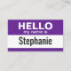Version violet et blanche Bonjour Mon nom est un design d'entreprise de base qui met en évidence votre nom d'employé. Le fameux - Bonjour, Mon nom est - look qui existe depuis des années est maintenant disponible à utiliser sur d'autres articles en plus des étiquettes et autocollants. Un look classique qui peut aussi être utilisé comme une drôle de fête.