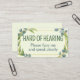 This card features the slogan 'Hard of Hearing' surrounded by a wreath of eucalyptus leaves, on a pale green background. Below it gives specific instructions on how to interact with you. Default is 'please face me and speak clearly.' You can edit the text and colors as needed. 🍃 For more useful deafness stationery, visit my store Zazzle.com/Elder_Vitality 🍃 For custom orders, message me on Zazzle