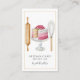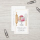 Ce mignon et fantaisiste pâtissier pâtissier de la boulangerie à l'aquarelle, carte de visite, dispose d'outils de boulangerie, épingle à rouler, fouet et un glorieux gâteau rose et blanc au milieu. Des outils simples du métier ! Votre nom signature dans la typographie de script et le nom de votre entreprise, avec le slogan : fait avec amour.