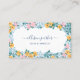 Beau carte de visite fleuri en blanc avec son nom dans un joli script fin et son titre en lettres élégantes encadrées d'une myriade de fleurs jaunes, de fleurs roses et de fleurs bleues. Sur le rose pâle de l'autre côté de la carte, ajoutez votre nom et vos coordonnées. Magnifique carte de visite pour un maquilleur, coiffeur, artiste de foudre, peintre à ongles, planificateur d'événements, design d'intérieur et bien plus encore.