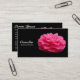 Un carte de visite avec un motif photo Camelia rouge. Nom d'entreprise etc sur le devant avec d'autres détails sur le verso avec le même motif et le même style.