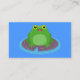 Cette mignonne grenouille verte et joyeuse assise sur un coussin de lys violet est lumineuse et adorable. Beaucoup d'amusement amphibien dessiné dans un joyeux style de dessin animé.