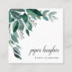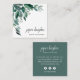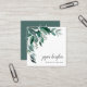Les cartes de visite botaniques chics, au format carré unique, sont ornés d'un jet d'aquarelle verte et de feuilles eucalyptus. Ajoutez votre nom et nom commercial ou titre/profession dans le coin inférieur droit. Cartes inversées à lettrage blanc sur un arrière - plan vert forêt. Comprend trois icônes de médias sociaux et un champ pour votre nom d'utilisateur.