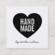 carte de visite moderne minimaliste avec le mot "fait main" en caractères gras en blanc contre un coeur noir et un script élégant pour votre nom ou nom de magasin en noir. Ce carte de visite carré élégant fait à la main est idéal pour les artisans et les fabricants de produits faits à la main comme les artistes, les tricots, les couturiers, etc. Il fonctionne aussi bien comme une étiquette-cadeau, une étiquette-cadeau ou une étiquette-produit pour vos produits faits à la main.