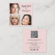 Blush pink business card with black typography and elegant script. Update qr code with your website, edit social media icons for your business and add 3 unique photos for your business. Message the designer for more customization options.