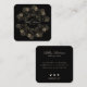 Elegant Chic Black and Gold Floral Script Monogramme Carré Carte de visite avec signature or fantaisie féminine nom complet devant mandala kaleido initiale monogrammée et florale répétée contre arrière - plan noir et détails en retour avec les médias sociaux.